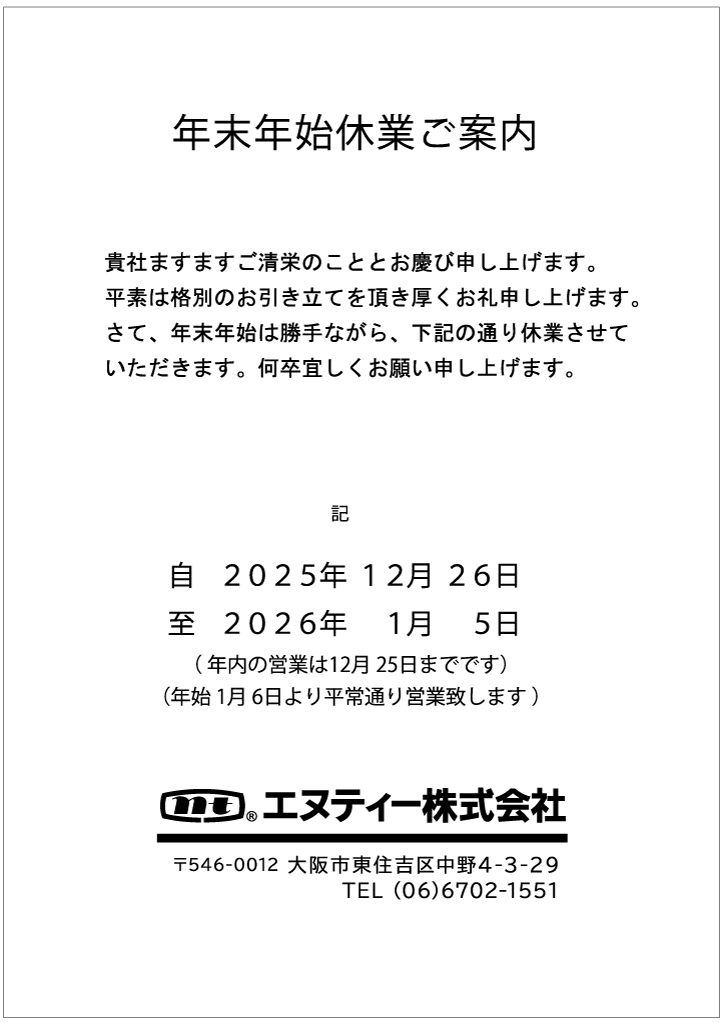 年末年始休業のお知らせ